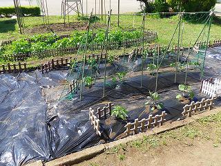 毎年農園活動が始まるこの時期に「田島農園」様からたくさんの野菜の苗を頂いています。今年もミニトマトやシシトウ・ピーマン・ナス・キュウリなど132本の苗を頂きました。早速、土作りを開始し畑を耕しました。そして今日、苗を丁寧に植えていきました。たくさんの野菜が収穫できるようにこれからしっかり世話をしていきたいと思います。