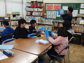 図書室から賑やかな声が聞こえてきたのでのぞいてみると、タブレットを使った授業を行っていました。各自が人権についてテーマを決めて調べていました。子ども達は手慣れた手つきでキーワードを打ち込んでいきます。子どもに話を聞くと、「今までのデスクトップより使いやすい。」「家にあるので慣れている。」「検索が早くなった。」「図書室で使えるので、友達と相談できる。」「テーブルを広く使えるのでプリントに書き込みやすい。」などタブレットになって良かったという意見が多く聞かれました。今までと違った使い方もできるようになりました。さらに効果的な活用をしていきたいと思います。