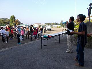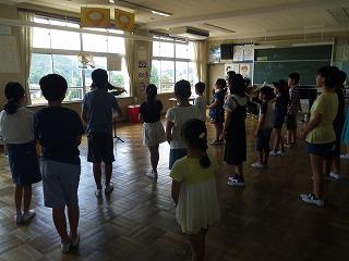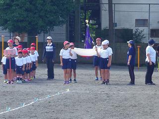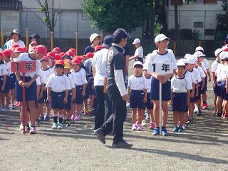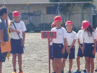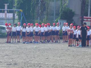 全体練習は、朝の涼しいうちに行おうということで、朝の練習で全校児童による開閉会式の練習が始まりました。5・6年生の開閉会式係児童の練習は一度だけ行いましたが、全体での練習はこれが初めてです。「どんなふうにやるのかな。」と見ていましたが、足踏みはきれいにそろい、全体での動きも特に問題なく進行されていました。係児童も真剣に活動しており、一回目の練習は合格でした。ただし、一つ心配なのが、昨日までの涼しさが全くなく、朝から気温は25度。夏の暑さが戻ってきました。熱中症対策をもう一度確認しました。練習の後は教室のエアコン始動、水分補給・汗をしっかり拭き取るなどの対策を行っていきたいと思います。