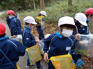 3年生が総合的な学習の時間「菊沢地区の自然を知ろう」の一環として生きがいの森での活動を行いました。昆虫・野鳥・植物などそれぞれがテーマごとにグループに分かれ、ボランティアの先生の指導のもと、生きがいの森での散策を行いました。数種類のバッタを捕まえて観察したり、双眼鏡で野鳥を観察したり、木や草花の様子を観察したりと子どもたちは身近なところに自然がたくさんあることに気付き、とても感心したようでした。「自然がたくさん残っている」「地域を大切にしていきたい」などの感想をもちました。最後は自然を大切にするために森の清掃をしようとゴミ拾いを行いました。