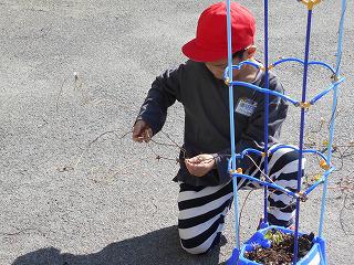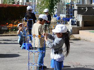 校庭から楽しげな声が聞こえてきたので行ってみると、1年生がアサガオの蔓をはずしながら丸めています。リースを作っていました。真剣な表情で取り組んでいました。どんなリースができるのか楽しみです。
