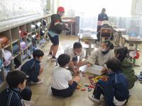 風邪などひかないように用心に用心を重ね、「気温が低いし雪が降っていたら外遊びは禁止」と、朝の時点で連絡しておきました。あいにく、業間の時間になっても雪はやみませんでした。子どもたちは室内で暖かく楽しく衣服を汚すことなく過ごしました。