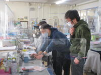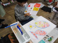 12月8日(水)雨の日の業間の様子です。1年1組と1年2組では図工の時間の延長でした。保護者の皆様にご協力いただいた版画のスタンプの材料に絵の具を付けて、気持ちよく押していました。とっても素敵な作品ができあがりそうです。