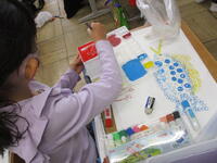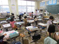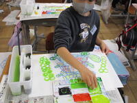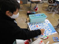 12月8日(水)雨の日の業間の様子です。1年1組と1年2組では図工の時間の延長でした。保護者の皆様にご協力いただいた版画のスタンプの材料に絵の具を付けて、気持ちよく押していました。とっても素敵な作品ができあがりそうです。