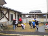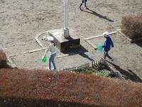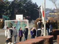 国旗掲揚塔の前では、6年生が5年生に「国旗掲揚の方法」を教えていました。