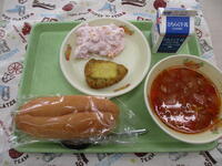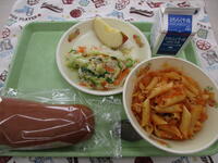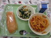 水曜日;ミルクパン、牛乳、ペンネボロネーゼ、ほうれん草とコーンのサラダ
