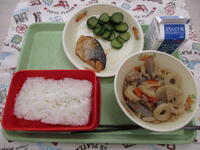 木曜日;ご飯、牛乳、アジフライ、磯煮、田舎汁