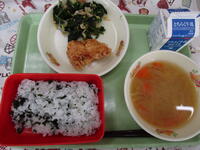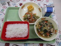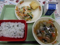 火曜日;わかめご飯、牛乳、厚焼き卵、北押原小柿のサラダ、つみれ汁