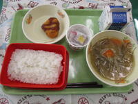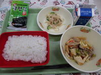 【火曜日】ご飯、牛乳、ホタテのソテー、海苔和え、根菜汁