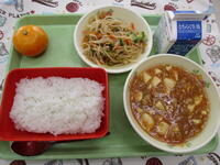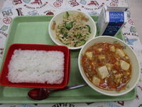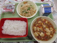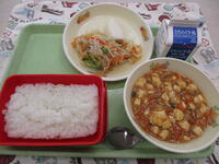 【火曜日】ご飯、牛乳、麻婆豆腐、くらげサラダ、梨