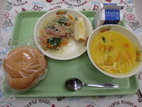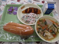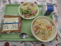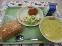 水曜日;食パン、ブルーベリージャム、牛乳、肉団子、ハムチーズサラダ、クラムチャウダー