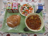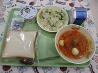 【金曜日】《さつきランチ》食パン、いちごジャム、牛乳、インド煮、干瓢のサラダ、県産ヨーグルト