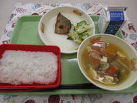【木曜日】ご飯、牛乳、鯖の味噌煮、海苔和え、豚汁、アセロラミルク