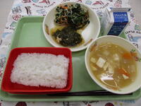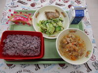 【月曜日】ご飯、牛乳、ベリーちゃんの卵焼き、のり和え、里芋と大根のそぼろ煮