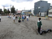 校庭の一角を設けて、寄贈されたグローブを使って遊んでいます。業間や昼休みを利用して、たくさん児童に触れてほしいです。まずは、キャッチボールで楽しんでいます。