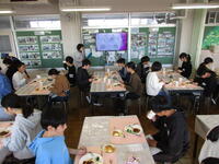 給食の時間に、本校の栄養教諭が給食の様子を参観しています。「美味しいです。」「また同じものを作ってください。」など、児童たちから声をかけられるそうです。