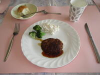 【金曜日】バターロール、牛乳、ハンバーグソースかけ、マッシュポテト、野菜スープ、イチゴ