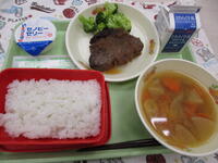【木曜日】ご飯、牛乳、県産豚肉ハンバーグニラソースかけ、ごま和え、なめこの味噌汁
