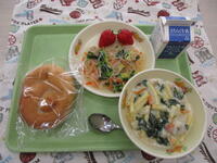 【水曜】県産小麦食パン、とちおとめイチゴジャム、牛乳、インド煮、かんぴょうサラダ、県産ヨーグルト