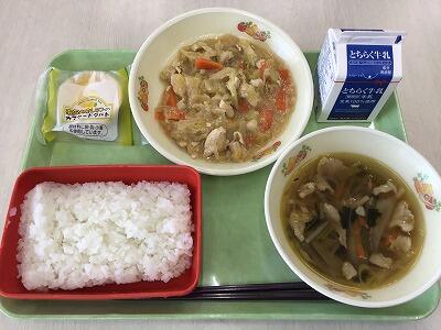 今日の献立は、ご飯、鶏ちゃん、沢煮椀、レモンカスタードタルト、牛乳でした。
