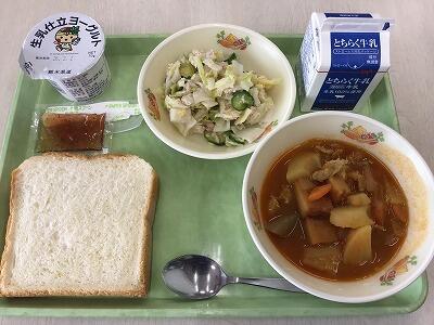 今日の献立は、さつきランチで、県産小麦食パン、とちあいかいちごジャム、インド煮、かんぴょうサラダ、県産ヨーグルト、牛乳でした。