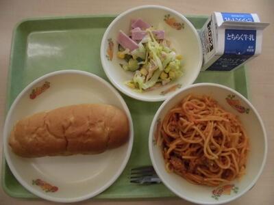 ツナトマトスパゲティ 牛乳 イタリアンサラダ 食パン チョコクリーム