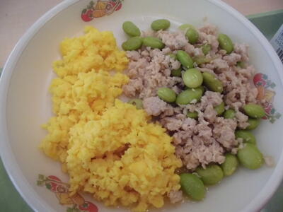 今日の給食は、人気メニューの三色丼です。
