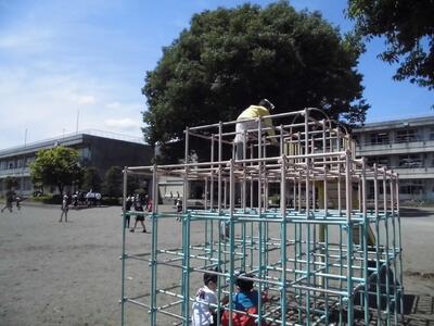 本校のシンボルツリーの大欅が大きな日陰を作ってくれています。児童は元気に走り回っています。