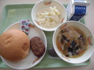 丸パン 牛乳 ハンバーグ ケチャップ チーズポテト ワンタンスープ