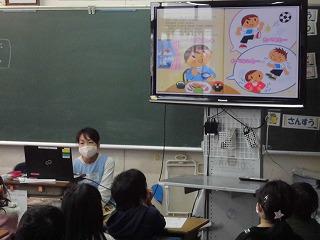 本日は、1年生での「食の指導」です。絵本を使ってバランスのよい食事について楽しく学ぶことができました。