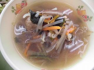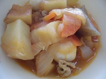 今日のメニューの「のっぺい汁」は、日本全国で親しまれている郷土料理の1つです。もとは、肉や魚を含まない精進料理の1つで、そこにとろみをつけた具だくさんのしるもののことです。里芋、大根、白菜、ねぎの冬が旬の食品が入っています。具だくさんで栄養たっぷりな汁物です。
