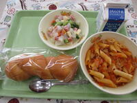 水曜日;ミルクパン、牛乳、ペンネボロネーゼ、ほうれん草とコーンのサラダ