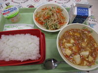 【火曜日】ご飯、牛乳、麻婆豆腐、くらげサラダ、梨