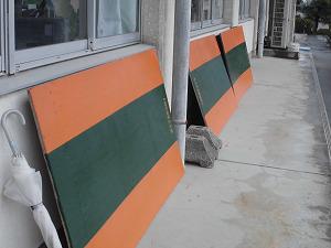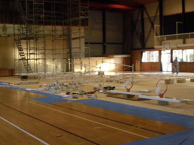 古いバスケットゴールは天井から撤去され、新しい耐震化されたゴールが床に準備されています。ある程度は下で組み立て、天井に上げてからさらに組み立てるとのことです。