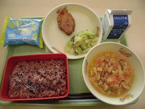 今日もおいしそうなメニューです。人気のわかめご飯が、変更で本日になりました。
