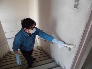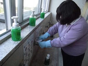 学校では、みなさんの学習に使うプリントづくりや、登校日に回収したプリントをチェックしたりしています。また、学校で居場所を提供していることから、下校後には、毎日、消毒をしています。