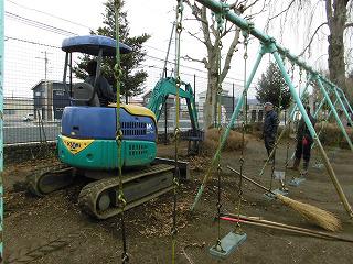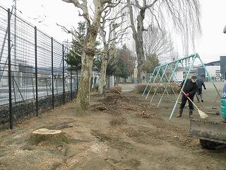 皆が遊んでいる中、教頭先生が草刈りをしています。