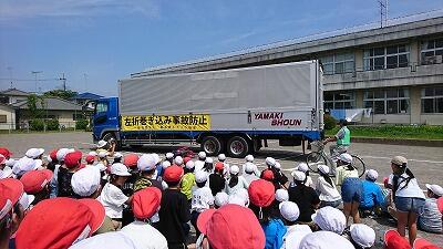 2時間目に鹿沼市交通政策課や鹿沼警察署、樅山駐在所、トラック協会の皆様の協力を得て、交通安全教室を行いました。