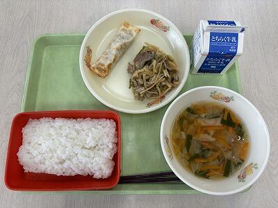今日の献立は、ご飯、餃子ロール、チンジャオロース、春雨スープ、牛乳でした。