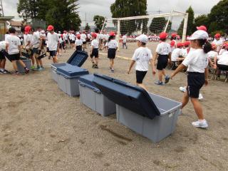 1年生から5年生までが早下校した午後1時30分から、明日の運動会の会場準備を行いました。6年生達とPTA役員の皆さん、職員総出で手際よく分担された仕事を進めました。強風が吹いた場合の安全面を考慮して、今年は「万国旗」の設置は見合わせましたので御了承ください。