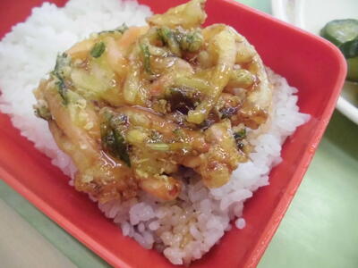 かき揚げ丼 牛乳 つみれ汁 キュウリのコロコロ漬け グミ
