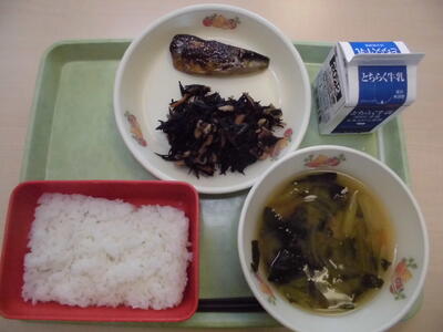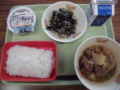 ごはん 牛乳 ごぼうとこんにゃくのしぐれ煮 かんぴょうの味噌汁 県民の日ゼリー