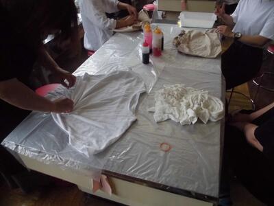 第1回目は「タイダイ染め」です。講師の齋藤先生にご指導していただきながら、参加者は思い思いの作品づくりに没頭していました。