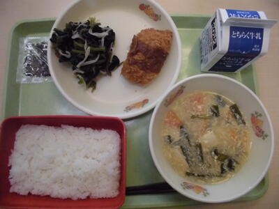 ごはん 牛乳 モロカツのみそソースかけ 和風和え 雷汁 のり