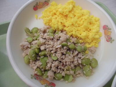 今日の三色丼は、小中学生の給食の人気メニューの一つです。暑くなっても、しっかり食べて、元気で過ごしてほしいと願っています。
