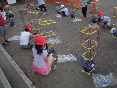 教室棟の前には、朝顔の鉢、花壇には野菜が育てられています。