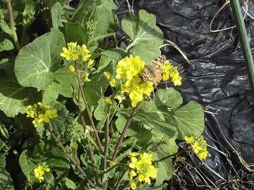 校庭の春の植物が花を咲かせ始めました。菜の花には、蝶が蜜を吸っています。