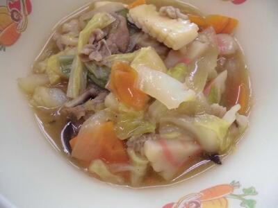 今日のメニューの「タイピーエン」は、肉や魚介類、野菜などを炒めて、春雨と鶏ガラ仕立てのスープを作る、熊本県の郷土料理です。もともとは、中国の料理に同じ名前の料理があり、アヒルのゆで卵を入れたたスープでした。日本に伝わって、独自の工夫が加えられ、オリジナルの料理となりました。
