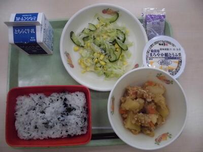 わかめごはん 牛乳 新じゃがいものそぼろ煮 豆腐サラダ