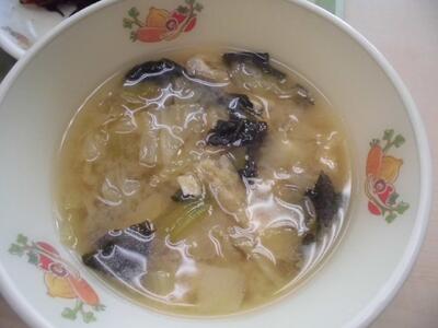 わかめご飯 牛乳 鶏肉の唐揚げ 即席漬け 吉野汁(「ゆ」ばが入っています)